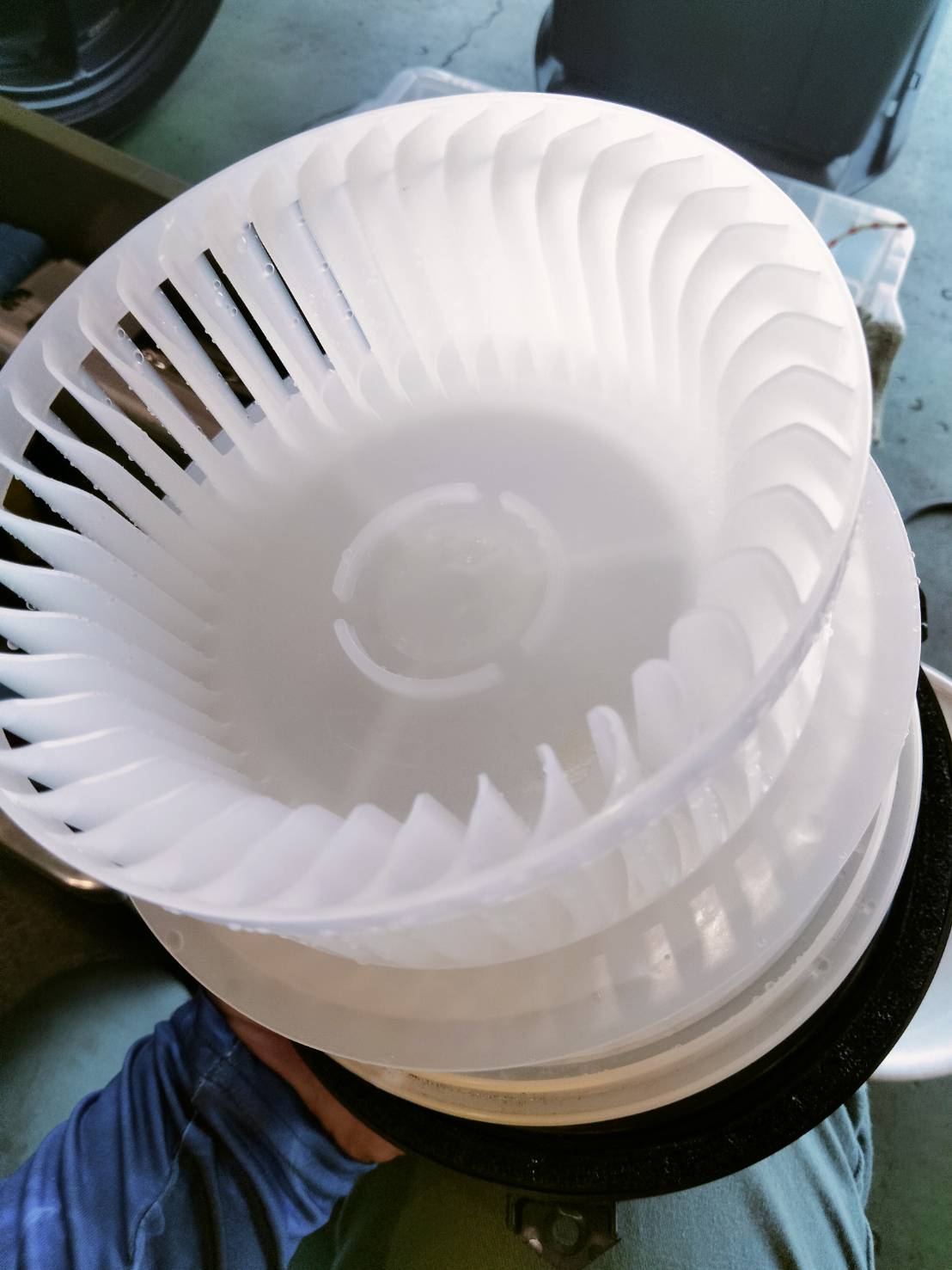 まずはファンの清掃です。写真を見ていただくとわかるのですが所々に黒カビが付着していますね😓排水にはカビがよく見えます‥